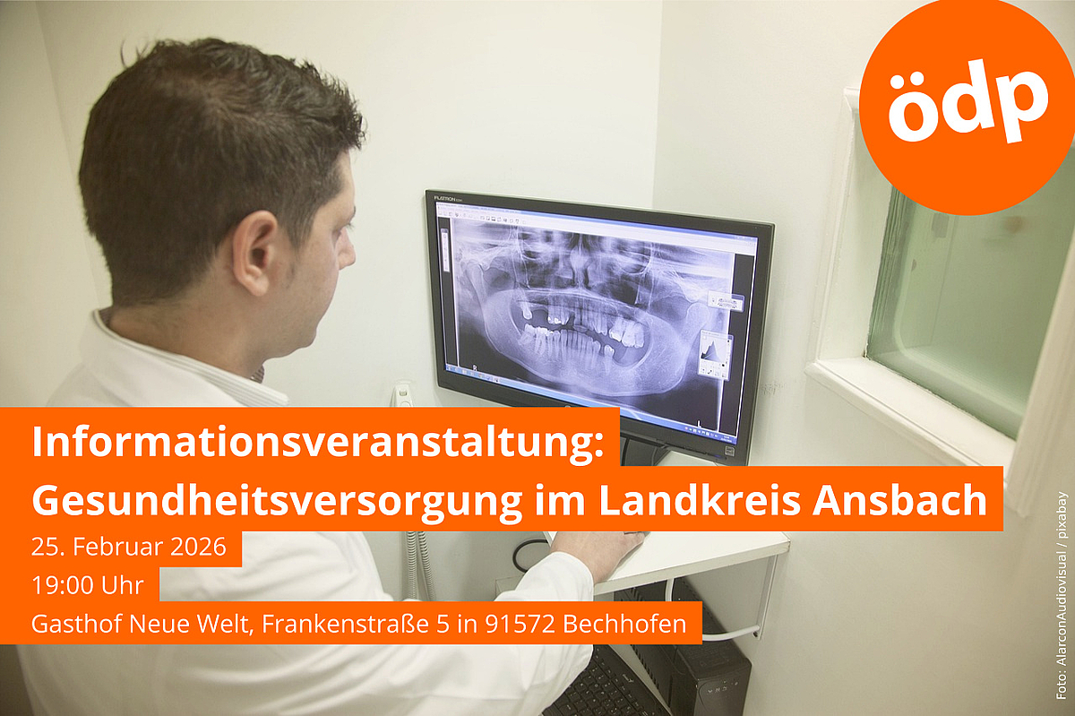 Die ÖDP-Kreistagsfraktion fordert seit Jahren den Neubau eines Klinikums für Stadt und Landkreis Ansbach in der Mitte des Landkreises mit einem breiten Leistungsspektrum und für alle Bürgerinnen und Bürger und dem Rettungsdienst gut erreichbar. Noch ist es nicht zu spät für die Umsetzung eines solchen Projekts. Über die Chancen und Vorteile eines Zentralklinikums werden der Arzt und Kreisrat Dr. Gerhard Schorndanner und die Landratskandidatin und Kreisrätin Maria Hetzel referieren und diskutieren. Die Veranstaltung findet am 25. Februar 2026 um 19:00 Uhr im Gasthof Neue Welt, Frankenstraße 5 in 91572 Bechhofen statt.