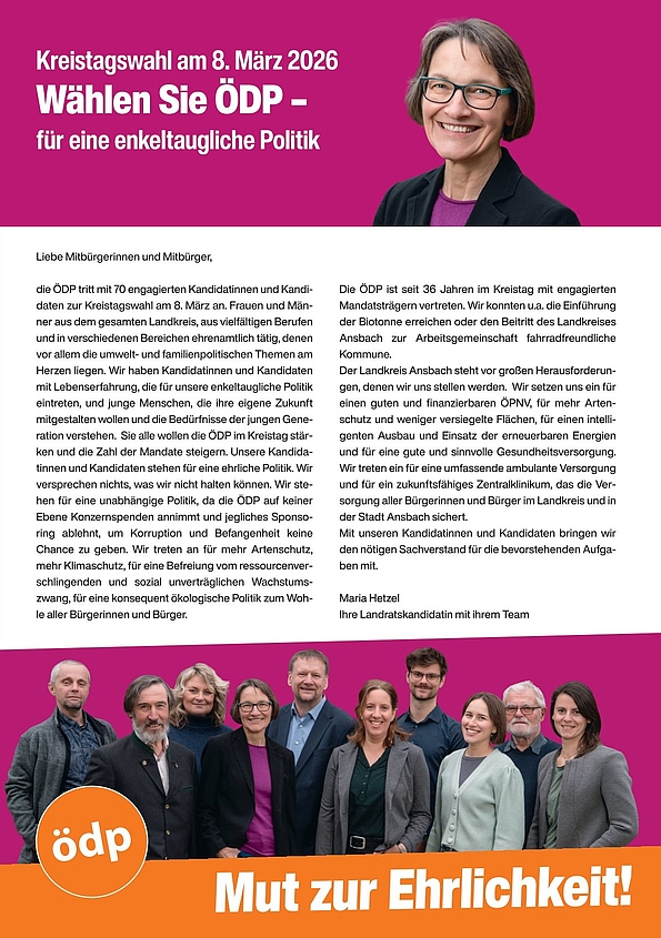Die ÖDP steht seit beinahe 36 Jahren für eine ehrliche, sachorientierte, nachhaltige und vor allem enkeltaugliche Politik im Ansbacher Kreistag. Mit meiner Kandidatur möchte ich diese Arbeit gerne fortsetzen zum Wohle aller Bürgerinnen und Bürger und unserer Umwelt.