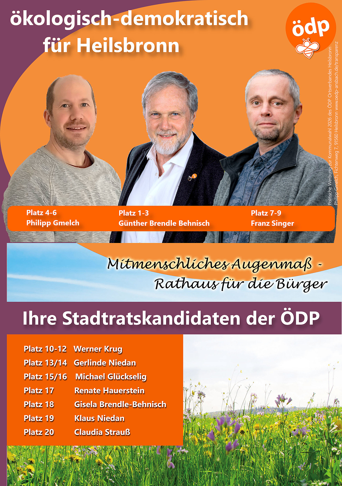 Nach den positiven Erfahrungen mit der Zusammenarbeit im Heilsbronner Stadtrat in den letzten Jahren, und aufgrund der Tatsache, dass die regionalen und überregionalen Problemstellungen, die es zu bewältigen gilt, eher größer als kleiner geworden sind, stand für den Ortsverband Heilsbronn außer Frage, wieder zu dieser Wahl anzutreten. Die aufgestellte Liste ist auch diesmal mit sehr engagierten Kandidatinnen und Kandidaten besetzt. Der Stadtrat und derzeitige Parteivorsitzende der ÖDP, Günther Brendle-Behnisch aus Weißenbronn, führt die Liste an. Auf Platz 2 und 3 stehen der stellvertretende Ortsverbandsvorsitzende Philipp Gmelch aus Bonnhof und Ortsverbandsvorsitzender Franz Singer aus Heilsbronn. Es folgen Werner Krug, Gerlinde Niedan, Michael Glückselig, Renate Hauerstein (alle Heilsbronn), Gisela Brendle-Behnisch (Weißenbronn), Klaus Niedan (Heilsbronn) und Claudia Strauß (Müncherlbach).